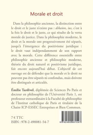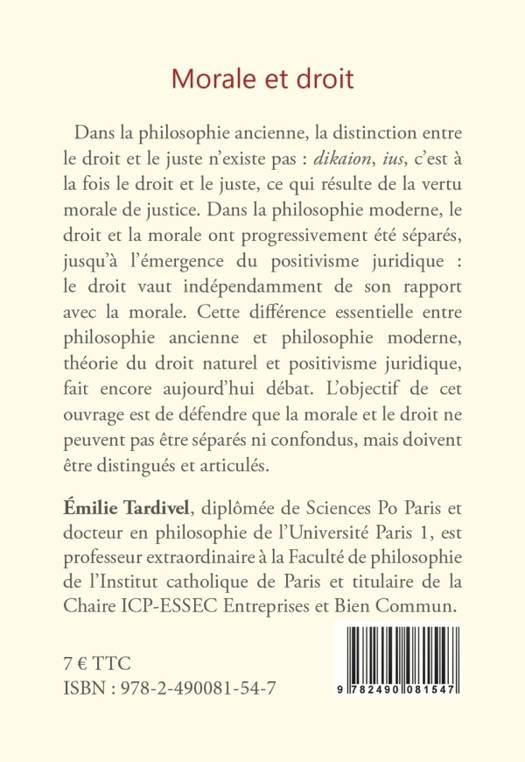 Dans la philosophie ancienne, la distinction entre le droit et le juste n'existe pas : dikaion, ius, c'est à la fois le droit et le juste, ce qui résulte de la vertu morale de justice. Dans la philosophie moderne, le droit et la morale ont progressivement été séparés, jusqu'à l'émergence du positivisme juridique : le droit vaut indépendamment de son rapport avec la morale. Cette différence essentielle entre philosophie ancienne et philosophie moderne, théorie du droit naturel et positivisme juridique, fait encore aujourd'hui débat. L'objectif de cet ouvrage est de défendre que la morale et le droit ne peuvent pas être séparés ni confondus, mais doivent être distingués et articulés.