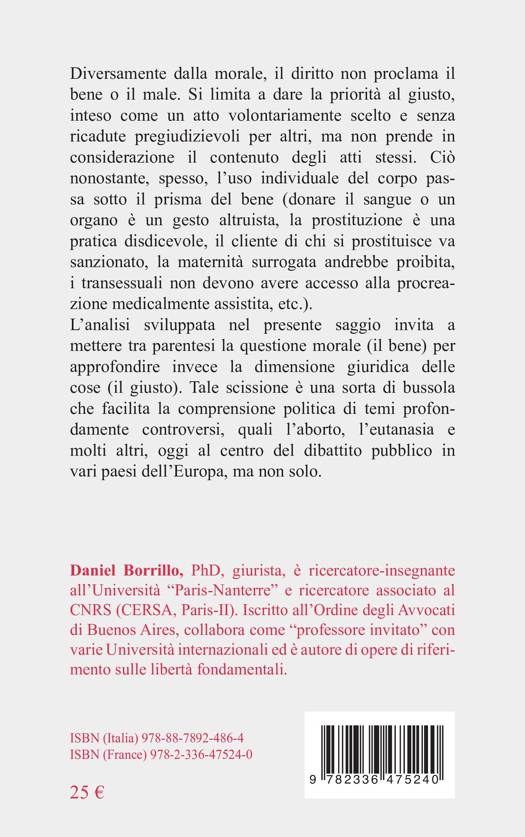 L'analisi sviluppata nel presente saggio invita a mettere tra parentesi la questione morale (il bene) per approfondire invece la dimensione giuridica delle cose (il giusto). Tale scissione è una sorta di bussola che facilita la comprensione politica di temi profondamente controversi, quali l'aborto, l'eutanasia e molti altri, oggi al centro del dibattito pubblico in vari paesi dell'Europa, ma non solo.