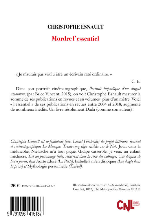 « Je n'aurais pas voulu être un écrivain raté ordinaire. » C. E. Dans son portrait cinématographique, Portrait impudique d'un drogué amoureux (par Brice Vincent, 2015), on voit Christophe Esnault mesurer la somme de ses publications en revues et en volumes : plus d'un mètre. Voici « l'essentiel » de ses publications en revues entre 2004 et 2018, augmenté de nombreux inédits. Un livre résolument Dada (comme son auteur) ! Le livre est imprimé en couleur, cousu sur papier bouffant, et a nécessité un fort travail graphique. C'est aussi, comme tous les livres de cet auteur, un hommage à l'oeuvre de Sarah Kane.