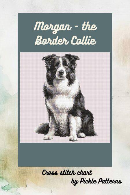 The cross stitch chart is a portrait of a seated border collie with white and black markings. The dog is the focus of the image with no clutter from background elements.