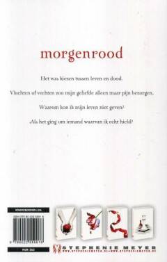 'Je hoeft niet bang te zijn,' mompelde ik. 'Wij horen bij elkaar.' Ik werd helemaal overweldigd door de waarheid van mijn eigen woorden. Dit moment was zo perfect, zo volmaakt, dat er simpelweg niet aan getwijfeld kon worden. Hij sloeg zijn armen om me heen en drukte me tegen zich aan, als zomer en winter. Ik had het gevoel dat elk zenuwuiteinde in mijn lichaam onder stroom stond. 'Voor altijd,' beaamde hij. Bella Swan heeft een roerig jaar vol verleidingen, verlies en strijd achter de rug en staat nu voor het ultieme keerpunt. Ze wordt verscheurd door haar intense passie voor Edward enerzijds en haar grote vriendschap met Jacob anderzijds. Kiest ze voor de duistere maar verleidelijke wereld van de onsterfelijken, of besluit ze toch een volledig menselijk en dus sterfelijk leven te leiden? Bella is de schakel geworden in het eeuwigdurende conflict tussen de weerwolven en de vampiers. Haar keuze bepaalt het lot van beide stammen. Morgenrood is het verbazingwekkende slot van het passionele en meeslepende liefdesverhaal van Bella en Edward, dat begon met Twilight, Nieuwe maan en Eclips. In Morgenrood worden de geheimen en mysteries van deze adembenemende serie eindelijk onthuld.