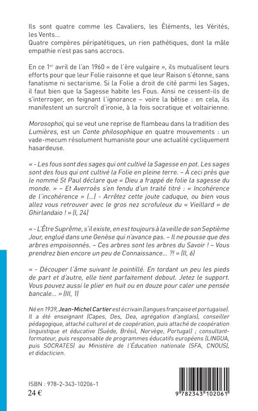 Morosophoï, qui se veut une reprise de flambeau dans la tradition des Lumières, est un conte philosophique en quatre mouvements : un vade-mecum résolument humaniste pour une actualité cycliquement hasardeuse.