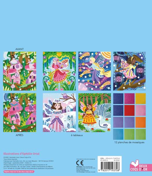 6 tableaux à compléter avec 1 200 mosaïques en mousse de 9 couleurs différentes dont 3 couleurs avec un effet pailleté. L'enfant est guidé grâce à des lettres sur les tableaux pour choisir ses mosaïques.