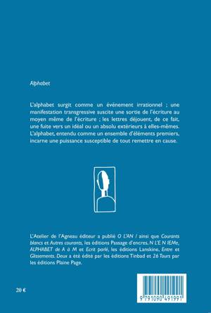 L'alphabet surgit comme un événement irrationnel ; une manifestation transgressive suscite une sortie de l'écriture au moyen même de l'écriture ; les lettres déjouent, de ce fait, une fuite vers un idéal ou un absolu extérieurs à elles-mêmes. L'alphabet, entendu comme un ensemble d'élément premiers, incarne une puissance susceptible de tout remettre en cause.
