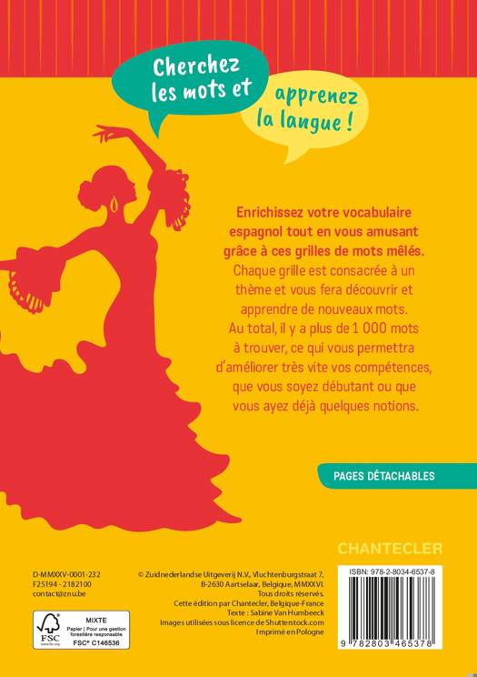 Enrichissez votre vocabulaire tout en vous amusant ! Enrichissez votre vocabulaire espagnol d’une manière amusante grâce à ce bloc de jeux rempli de mots mêlés. Chaque grille est consacrée à un thème en particulier, ce qui vous permet à chaque fois de découvrir et d’apprendre des mots différents. Avec plus de 50 thèmes et 1000 mots à trouver, vous réviserez votre espagnol et améliorerez vos compétences, que vous soyez débutant ou ayez déjà des bases. Les solutions se trouvent à la fin du bloc. Avec pages détachables.