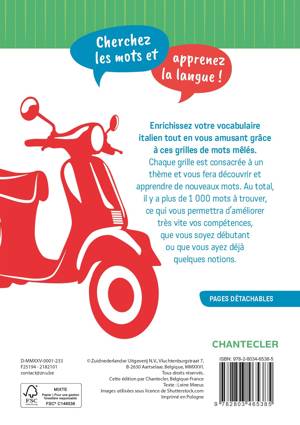 Enrichissez votre vocabulaire tout en vous amusant ! Enrichissez votre vocabulaire italien d’une manière amusante grâce à ce bloc de jeux rempli de mots mêlés. Chaque grille est consacrée à un thème en particulier, ce qui vous permet à chaque fois de découvrir et d’apprendre des mots différents. Avec plus de 50 thèmes et 1000 mots à trouver, vous réviserez votre italien et améliorerez vos compétences, que vous soyez débutant ou ayez déjà des bases. Les solutions se trouvent à la fin du bloc. Avec pages détachables.