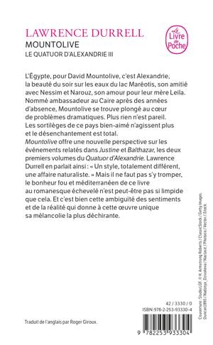 Mountolive offre une nouvelle perspective sur les événements relatés dans Justine et Balthazar, es deux premiers volumes du Quatuor d'Alexandrie, l'oeuvre romanesque maîtresse de Lawrence Durrell (1912-1990) . L'ambassadeur anglais, Mountolive, en devient le personnage principal. Il a parcouru l'Europe de l'avant-guerre, surpris à Berlin le mari de la belle et mystérieuse Justine en train d'acheter de armes pour défendre les coptes contre les Anglais. En bref, il perd ses illusions en découvrant la véritable personnalité de ses amis...