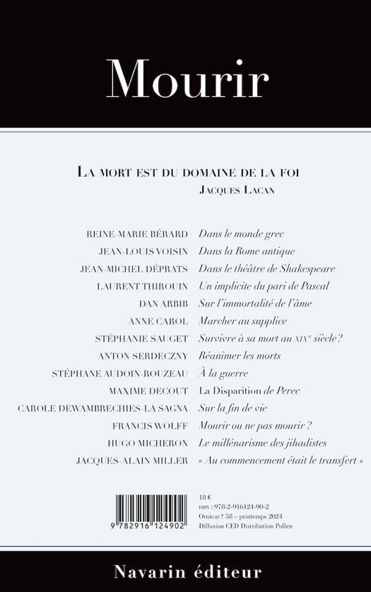 « Ornicar ? », après « Dire » et « Croire », poursuit avec « Mourir ».<br /> Les débats sur l’euthanasie ou sur le droit de choisir sa mort, le retour de la violence de guerre font l’actualité de la question de la mort. <br /> Toujours là, pour chaque vivant, elle se présente sous des masques différents en fonction des lieux, des temps ou encore de l’échelle envisagée, collective ou individuelle. « Ornicar ? » 58 se penche sur les dimensions symboliques, imaginaires et réelles de la mort – réel au sens de Lacan, à savoir l’impossible.<br /> Pour ce numéro 58, « Ornicar ? », revue de psychanalyse ouverte aux champs de savoir, voyage de la Grèce archaïque à l’époque contemporaine. Les contributions d’historiens, philosophes, chercheurs en littérature ou en sciences politiques, psychanalystes abordent notamment : « mourir à la guerre », « marcher à l’échafaud », « survivre à sa mort » (du XIXe au transhumanisme), « mourir au théâtre ou dans le roman policier », et encore, « l’immortalité », « La Disparation » (Pérec), « la mort volontaire »...<br /> Jacques-Alain Miller nous invite à faire retour, à partir de la fin, sur la question du commencement. La fin d’une analyse, dit-il, se déduit de son début.<br /> « À la fin c’est toujours la mort qui gagne », disait Staline à la façon de La Palisse, avec un accent de fatalité que la psychanalyse ne partage pas, malgré sa force d’évidence. Lacan énonce : « La mort est du domaine de la foi. » <br />