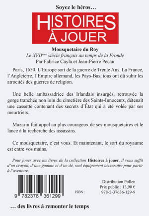 Paris, 1650. L'Europe sort de la guerre de Trente Ans. La France, l'Angleterre, l'Empire allemand, les Pays-Bas, tous ont dû subir les atrocités des guerres de religion. Une belle ambassadrice des Irlandais insurgés, retrouvée la gorge tranchée non loin du cimetière des Saints-Innocents, détenait une cassette contenant des secrets d'État qui a été volée par ses meurtriers. Mazarin fait appel au plus courageux de ses mousquetaires et le lance à la recherche des assassins. Ce mousquetaire, c'est vous. Et maintenant, le sort du royaume est entre vos mains.