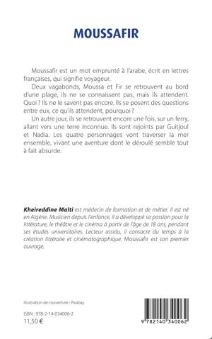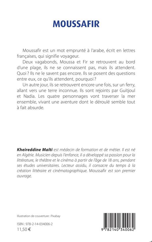 Moussafir est un mot emprunté à l'arabe, écrit en lettres françaises, qui signifie voyageur. Deux vagabonds, Moussa et Fir se retrouvent aux bords d'une plage, ils ne se connaissent pas, mais ils attendent. Quoi ? Ils ne le savent pas encore. Ils se posent des questions entre eux, ce qu'ils attendent, pourquoi ? Un autre jour, ils se retrouvent encore une fois, sur un ferry, allant vers une terre inconnue. Ils sont rejoints par Guitjoul et Nadia. Les quatre personnages vont traverser la mer ensemble, vivant une aventure dont le déroulé semble tout à fait absurde.