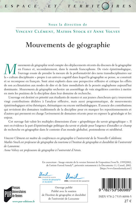 Ce livre rend compte des déplacements récents du discours de la géographie en France. De visée épistémologique, il associe des contributions qui revisitent des domaines traditionnels de la discipline pour en marquer les repositionnements et d'autres qui prennent en charge l'avènement de domaines récents pour en exposer la généalogie et les enjeux.