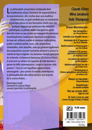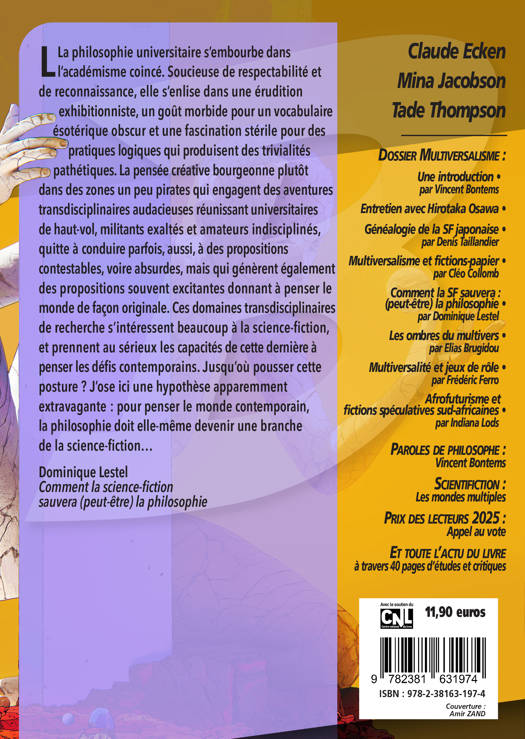 Porté par le philosophe des sciences et des techniques, directeur de recherches au Commissariat à l’énergie atomique, Vincent Bontems, le dossier au cœur de ce numéro 120, ambitieux, propose d’aborder de nouvelles façons d'envisager le futur, et de fait les problématiques de notre présent : le Multiversalisme, donc, à travers une série d’articles vivifiants destinés à explorer ces nouvelles voix. Au sommaire, des essais et entretiens avec et de : Hirotaka Osawa, qui a organisé le premier Congrès des études de l’imagination et du Multiversalisme à l’Université Keio, à Yokohama, le 10 et 11 juin dernier 2025 ; la philosophe Cléo Collomb, qui explore l’œuvre d’Ursula Le Guin et son approche multiverselle à travers le concept de fictions-panier ; le philosophe Dominique Lestel, qui livre un percutant essai, « Pourquoi la science-fiction sauvera (peut-être) la philosophie » ; le chercheur Elias Brugidou, qui propose une étude passionnante sur la façon dont l’extrême droite récupère les idées de la science-fiction ; ou encore Indiana Lods, spécialiste de la littérature anglophone du XXIe siècle, qui s’intéresse ici aux littératures spéculatives sud-africaines et afro-américaines. Sans oublier quelques autres surprises, bien entendu…