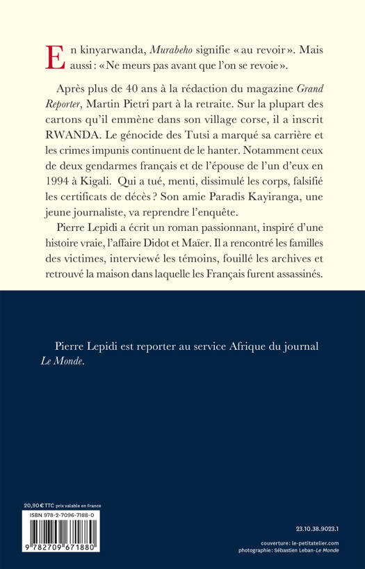 En kinyarwanda, Murabeho signifie « au revoir ». Mais aussi : « Ne meurs pas avant que l’on se revoie ». Après plus de 40 ans à la rédaction du magazine Grand Reporter, Martin Pietri part à la retraite. Sur la plupart des cartons qu’il emmène dans son village corse, il a inscrit RWANDA. Le génocide des Tutsi a marqué sa carrière et les crimes impunis continuent de le hanter. Notamment ceux de deux gendarmes français et de l’épouse de l’un d’eux en 1994 à Kigali. Qui a tué, menti, dissimulé les corps, falsifié les certificats de décès ? Son amie Paradis Kayiranga, une jeune journaliste, va reprendre l’enquête.