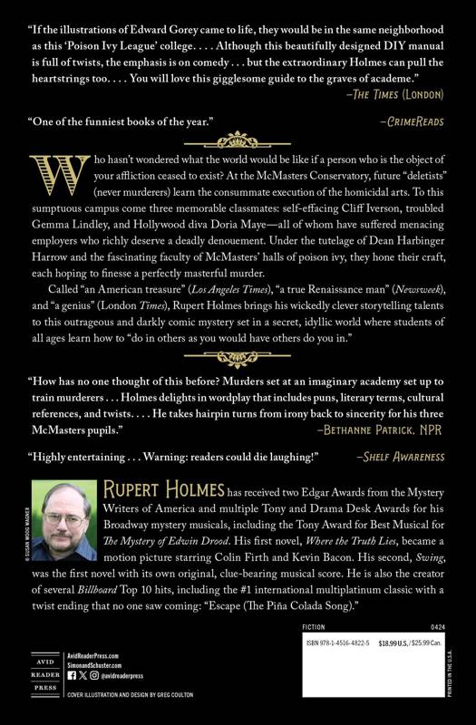 A New York Times bestseller! From Edgar Award-winning novelist, playwright, and story-songwriter Rupert Holmes comes a diabolical thriller with a killer concept: The McMasters Conservatory for the Applied Arts, "a fantasy academy laid out like a combination of Hogwarts, Downton Abbey, and a White Lotus-style resort" (Los Angeles Times) dedicated to the art of murder where students study how best to "delete" their most deserving victim. Who hasn't wondered for a split second what the world would be like if a person who is the object of your affliction ceased to exist? But then you've probably never heard of The McMasters Conservatory, dedicated to the consummate execution of the homicidal arts. To gain admission, a student must have an ethical reason for erasing someone who deeply deserves a fate no worse (nor better) than death. The campus of this "Poison Ivy League" college--its location unknown to even those who study there--is where you might find yourself the practice target of a classmate...and where one's mandatory graduation thesis is getting away with the perfect murder of someone whose death will make the world a much better place to live.