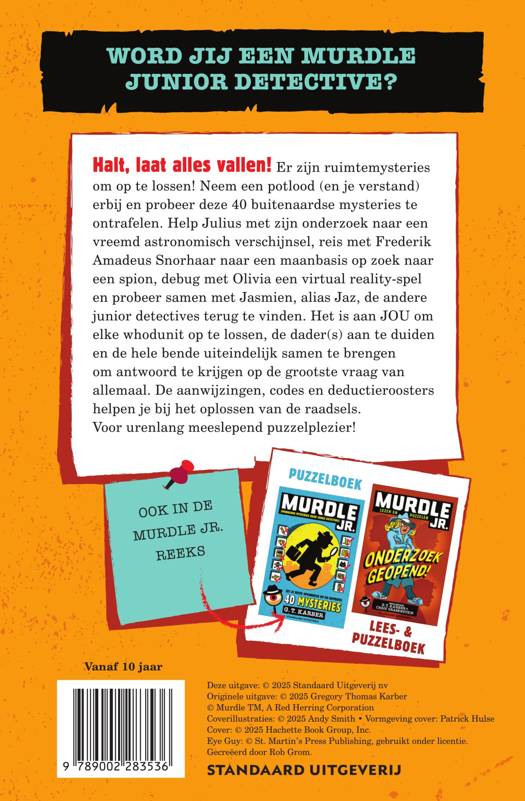Halt, laat alles vallen: er zijn ruimtemysteries om op te lossen! Neem een potlood (en je verstand) erbij en probeer deze 40 astronomische mysteries te ontrafelen. Help Julius met het oplossen van een astrologisch vraagstuk, reis met Frederik Amadeus Snorhaar naar een maanbasis op zoek naar een spion, debug met Olivia een virtual reality-spel en probeer samen met Jasmien de andere junior detectives terug te vinden. Het is aan JOU om elke whodunit op te lossen, de dader(s) aan te duiden en de hele bende uiteindelijk samen te brengen om antwoord te krijgen op de grootste vraag van allemaal. De aanwijzingen, codes en detectiveroosters helpen je bij het oplossen van de raadsels. Voor urenlang meeslepend puzzelplezier!