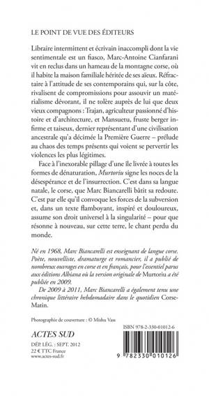 Né d'une île, la Corse, et de la langue qui s'y parle, «Murtoriu» convoque les forces de la subversion dans un texte flamboyant, inspiré et douloureux, et assume son droit universel à la singularité - pour que résonne à nouveau, sur cette terre, le chant perdu du monde.