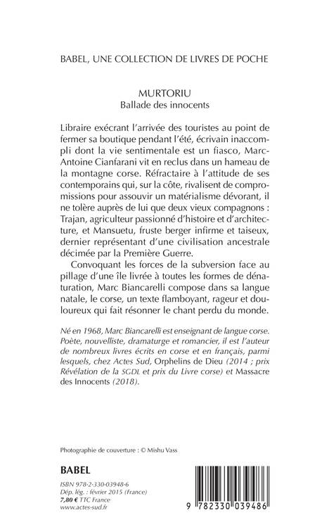 Libraire intermittent et écrivain inaccompli dont la vie sentimentale est un fiasco, Marc-Antoine Cianfarani vit en reclus dans un hameau de la montagne corse d'où il assiste au pillage d'une côte livrée à toutes les formes de dénaturation. Né d'une île et de la langue qui s'y parle, «Murtoriu» convoque les forces de la subversion dans un texte flamboyant, inspiré et douloureux.