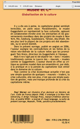 Il y a dix ans à peine, le capitalisme global semblait invincible. Parallèlement, le musée Guggenheim en représentait la face culturelle, agissant en collaboration étroite avec les entreprises et les gouvernements dans des projets de musée à New_York, Rio, Salzburg, Guadalajara, Taïwan, Abu Dhabi... aujourd'hui au point mort. Cet ouvrage traduit de l'anglais par l'auteur souligne les contradictions et les failles de la vision néo-libérale de la culture.