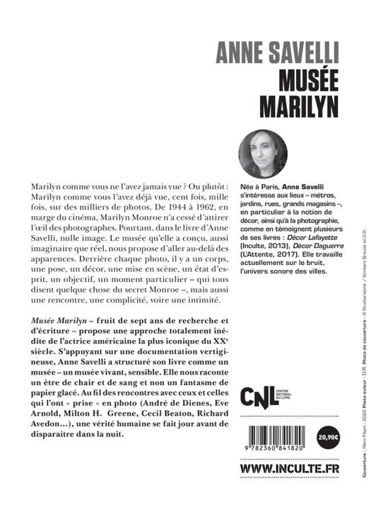 Musée Marilyn nous propose une approche totalement inédite de l'actrice américaine la plus iconique du XXème siècle. S'appuyant sur une documentation vertigineuse, Anne Savelli, qui a structuré son livre comme un musée - un musée vivant, sensible, quasi animé -, nous raconte enfin un être de chair et de sang et non un fantasme de papier glacé. Au fil des rencontres avec ceux et celles qui l'ont « prise » en photo (André de Dienes, Eve Arnold, Milton H. Greene, Cecil Beaton, Richard Avedon...), à force de scruter les instants, tragiques ou magiques, qui donnent naissance à la galaxie Marilyn, l'auteure réussit le tour de force de nous donner à voir autre chose que la surface de « la plus belle femme de tous les temps », et ce grâce à une écriture virtuose, alliant une attention extrême à une empathie troublante, une écriture capable de transcender la description pour atteindre la vérité humaine.