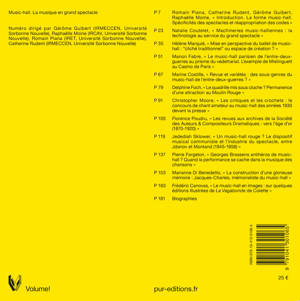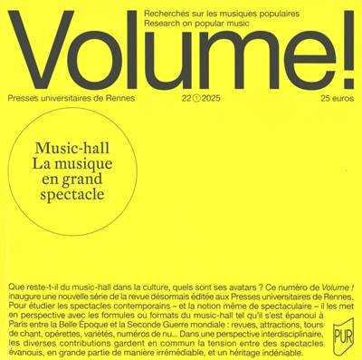 Que reste-t-il du music-hall dans la culture, quels sont ses avatars ? Ce numéro de Volume ! inaugure une nouvelle série de la revue désormais éditée aux Presses universitaires de Rennes. Pour étudier les spectacles contemporains – et la notion même de spectaculaire – il les met en perspective avec les formules ou formats du music-hall tel qu’il s’est épanoui à Paris entre la Belle Époque et la Seconde Guerre mondiale : revues, attractions, tours de chant, opérettes, variétés, numéros de nu... Dans une perspective interdisciplinaire, les diverses contributions gardent en commun la tension entre des spectacles évanouis, en grande partie de manière irrémédiable, et un héritage indéniable.