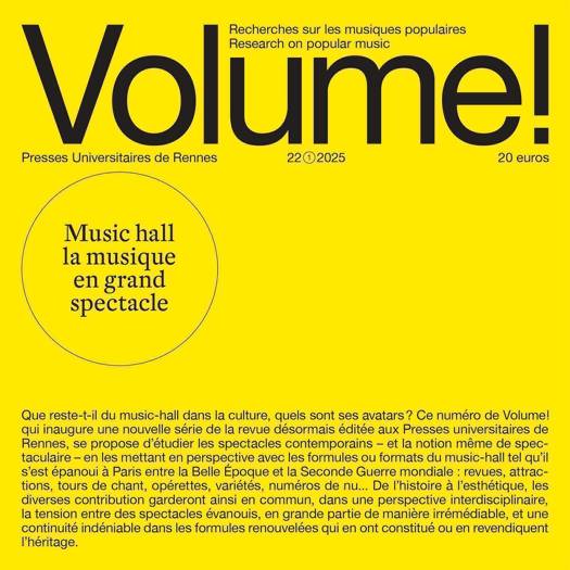 Que reste-t-il du music-hall dans la culture, quels sont ses avatars ? Ce numéro de Volume ! inaugure une nouvelle série de la revue désormais éditée aux Presses universitaires de Rennes. Pour étudier les spectacles contemporains – et la notion même de spectaculaire – il les met en perspective avec les formules ou formats du music-hall tel qu’il s’est épanoui à Paris entre la Belle Époque et la Seconde Guerre mondiale : revues, attractions, tours de chant, opérettes, variétés, numéros de nu... Dans une perspective interdisciplinaire, les diverses contributions gardent en commun la tension entre des spectacles évanouis, en grande partie de manière irrémédiable, et un héritage indéniable.