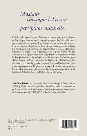 Cinéma, télévision, Internet : face à ces nouveaux moyens de diffusion de la musique classique, quelle attitude adopter ? Traditionnellement, ces pratiques sont entourées de méfiance, voire de mépris. L'étude de l'histoire et des techniques de captation filmique des concerts et opéras permet de déterminer les modifications que le filmage induit sur la perception de la musique. Les phénomènes récents et en cours d'explosion, comme le vidéoclip classique, sont pris en considération.