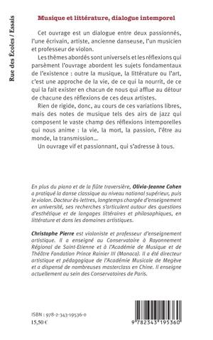 Cet ouvrage est un dialogue entre deux passionnés, l'une écrivain, artiste, ancienne danseuse, l'un musicien et professeur de violon. Les thèmes abordés sont universels et les réflexions qui parsèment l'ouvrage abordent les sujets fondamentaux de l'existence : outre la musique, la littérature ou l'art, c'est une approche de la vie qui afflue au détour de chaque pensée échangée. Rien de rigide donc au cours de ces variations libres, mais des notes de musique tels des airs de jazz qui composent le vaste champ des réflexions intemporelles qui nous animent : la vie, la mort, la passion, l'être au monde, la transmission...
