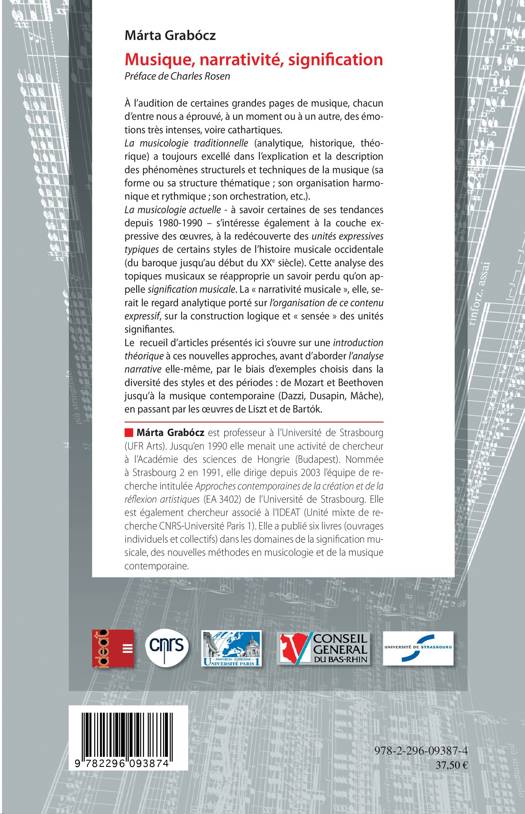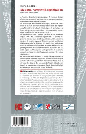 La musicologie actuelle s'intéresse à la couche expressive des oeuvres, à la redécouverte des unités expressives typiques de certains styles de l'histoire musicale occidentale (du baroque jusqu'au début du XXe siècle). Cette analyse des topiques musicaux se réapproprie un savoir musical qu'on appelle signification musicale. La narrativité musicale serait le regard analytique porté sur l'organisation de ce contenu expressif. Cette étude parcourt une diversité de styles et de périodes : de Mozart à Beethoven jusqu'à la musique contemporaine (Dazzi, Dusapin, Mâche) en passant par Liszt ou Bartòk.
