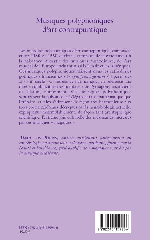 Les musiques polyphoniques d'art contrapuntique, composées entre 1180 et 1530 environ, correspondent à la naissance de l'art musical de l'Europe, de la Russie et des Amériques. Ces musiques naissent dans les cathédrales gothiques « franciennes » à partir des XII-XIIIe siècles. Elles synthétisent la puissance et l'élégance, tant mathématique que littéraire, et elles s'adressent de façon très harmonieuse aux trois cortex cérébraux décryptés par la neurobiologie actuelle, expliquant vraisemblablement, de façon tant artistique que scientifique, l'extrême joie culturelle des mélomanes intéressés par ces musiques « magiques ».