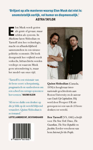 Elon Musk wordt gezien als genie of gevaar, maar zelden als systeem. In Muskisme laten Slobodian en Tarnoff zien hoe technologie, macht en afhankelijkheid samensmelten in een nieuwe politieke economie. Dit boek doorgrondt hoe vrijheid wordt verkocht, hiërarchieën worden verdiept en waarom Musk geen uitzondering is, maar het model van onze tijd.