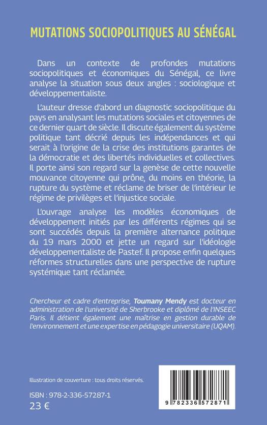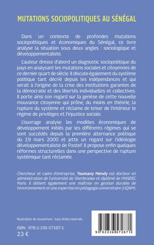 Dans un contexte de profondes mutations sociopolitiques et économiques du Sénégal, ce livre analyse la situation sous deux angles: sociologique et développementaliste. L'auteur dresse d'abord un diagnostic sociopolitique du pays en analysant les mutations sociales et citoyennes de ce dernier quart de siècle. Il discute également du système politique tant décrié depuis les indépendances et qui serait à l'origine de la crise des institutions garantes de la démocratie et des libertés individuelles et collectives. Il porte ainsi son regard sur la genèse de cette nouvelle mouvance citoyenne qui prône, du moins en théorie, la rupture du système et réclame de briser de l'intérieur le régime de privilèges et l'injustice sociale. L'ouvrage analyse les modèles économiques de développement initiés par les différents régimes qui se sont succédés depuis la première alternance politique du 19 mars 2000 et jette un regard sur l'idéologie développementaliste de Pastef. Il propose enfin quelques réformes structurelles dans une perspective de rupture systémique tant réclamée.