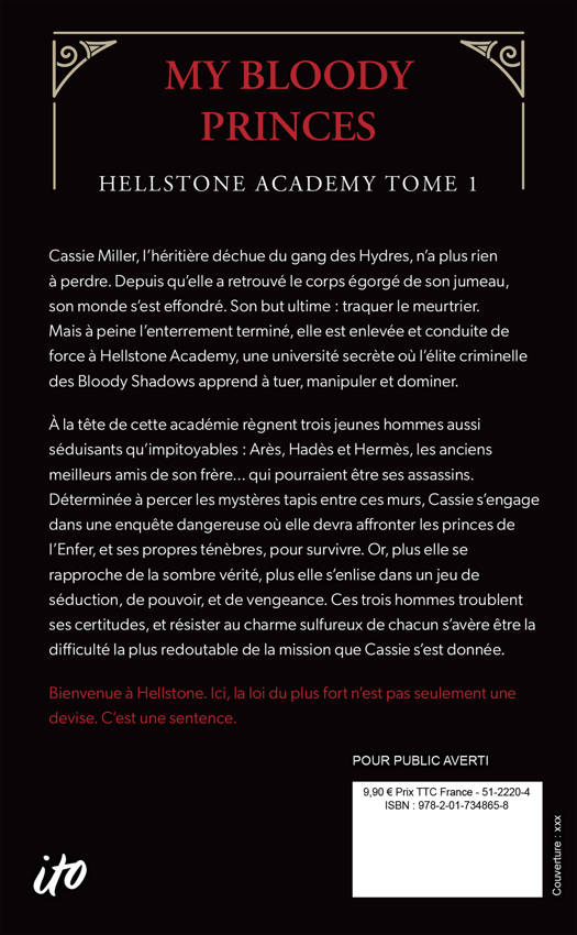 À la tête de cette académie règnent trois jeunes hommes aussi séduisants qu’impitoyables : Arès, Hadès et Hermès, les anciens meilleurs amis de son frère… qui pourraient être ses assassins. Déterminée à percer les mystères tapis entre ces murs, Cassie s’engage dans une enquête dangereuse où elle devra affronter les princes de l’Enfer, et ses propres ténèbres, pour survivre. Or, plus elle se rapproche de la sombre vérité, plus elle s’enlise dans un jeu de séduction, de pouvoir, et de vengeance. Ces trois hommes troublent ses certitudes, et résister au charme sulfureux de chacun s’avère être la difficulté la plus redoutable de la mission que Cassie s’est donnée.