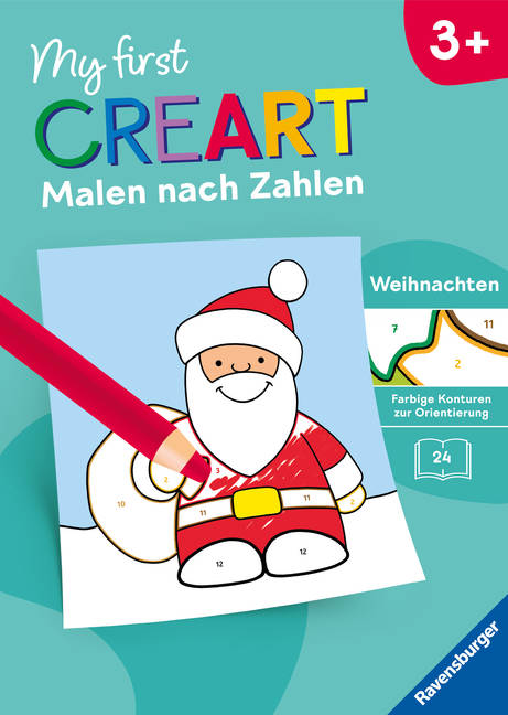 Weihnachtliche Ausmalmotive für die Kleinsten - perfekt für die Adventszeit! Kinderleicht ausmalen - dieses Malbuch enthält 24 niedliche Motive rund um das Thema Weihnachten: Tannenbaum, Weihnachtsmann, Lebkuchen und mehr. Kinder ab 3 Jahren malen die nummerierten Felder aus. Die farbigen Konturen helfen bei der Auswahl der Farben. So entstehen im Handumdrehen wunderschöne Kunstwerke. Die Farbpalette der Motive umfasst 12 Farben. Die Ravensburger Erfolgsreihe CreArt - Malen nach Zahlen macht Malen zum Kinderspiel: Alle Ausmalfelder enthalten Zahlen, die die Farben vorgeben. Feld für Feld entstehen so ansprechende, detailreiche Bilder. Kinder malen erfolgreich auch anspruchsvolle Motive, wie Dinosaurier oder Pferde. Die Malbuch-Reihe enthält Angebote für drei Altersstufen: ab 3 Jahren, ab 5 Jahren und ab 7 Jahren. Je nach Alter variiert die Größe der Malflächen. Sehr kleine Flächen sind vorgefärbt. Die Farbe der Zahlen erleichtert Vorschulkindern die Zuordnung. So können die Kinder ganz nebenbei die Zahlen lernen. CreArt - Malen nach Zahlen gibt es auch mit Überraschungseffekt. In Heften mit Zauberpapier werden beim Ausmalen zusätzlich versteckte Details sichtbar. Das ist magisch und motiviert zum Fertigmalen. CreArt ist Malspaß mit Erfolgsgarantie und ein perfektes Geschenk für Mädchen und Jungen.