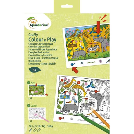 Graffy Colour & Play Cherche et trouve, Zoo DEUX ACTIVITÉS EN UNE : un jeu de 'cherche et trouve' en couleur sur le thème de la mer, suivi d'une activité de coloriage où votre enfant crée son propre jeu ! 24 FEUILLES dont : 12 ILLUSTRATIONS et jeu cherche et trouve en couleur et 12 ILLUSTRATIONS à colorier PAPIER DESSIN CLAIREFONTAINE 160 g : coloriage aux feutres ou aux crayons de couleur CONFORME AUX NORMES CE - À partir de 5 ans Certifié PEFC pour la gestion raisonnée des forêts
