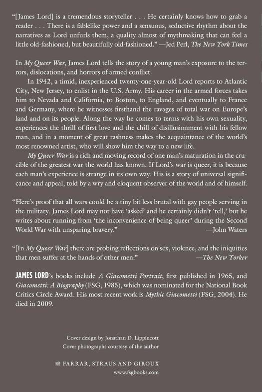 In 1942, a timid, inexperienced twenty-one-year-old Lord reports to Atlantic City, New Jersey, to enlist in the U.S. Army. His career in the armed forces takes him to Nevada, California, Boston, England, and, eventually, France and Germany, where he witnesses firsthand the ravages of total war on Europe's land and on its people. Along the way he comes to terms with his own sexuality, experiences the thrill of first love and the chill of disillusionment with his fellow man, and in a moment of great rashness makes the acquaintance of the world's most renowned artist, who will show him the way to a new life. My Queer War is a rich and moving record of one man's maturation in the crucible of the greatest war the world has known. If his war is queer, it is because each man's experience is strange in its own way. His is a story of universal significance and appeal, told by a wry and eloquent observer of the world and of himself.