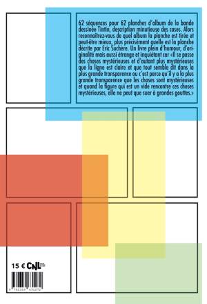 62 séquences pour 62 planches d’album de la bande dessinée Tintin, description minutieuse des cases. Alors reconnaîtrez-vous de quel album la planche est tirée et peut-être mieux, plus précisément quelle est la planche décrite par Eric Suchère. Un livre plein d’humour, d’originalité mais aussi étrange et inquiétant car «Il se passe des choses mystérieuses et d’autant plus mystérieuses que la ligne est claire et que tout semble dit dans la plus grande transparence ou c’est parce qu’il y a la plus grande transparence que les choses sont mystérieuses et quand la figure qui est un vide rencontre ces choses mystérieuses, elle ne peut que suer à grandes gouttes.»