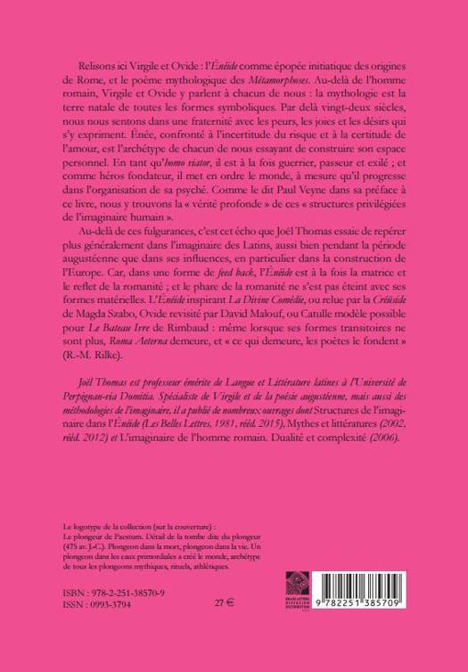English summary: Joel Thomas offers readers a dynamic and innovative analysis of Virgils Aeneid and Ovids Metamorphoses. Applying the methodological theories of myth criticism and myth analysis, Thomas brings to light the development of symbolic mythical and mythological forms and the essential influence of these texts on the Western imagination. French description: Osons le dire, ce qu'on va lire sous la plume de Joel Thomas me parait etre fondamental en son domaine. (...) Pour beaucoup de lecteurs, ce livre va etre une heureuse surprise et aussi une source de benefices de tout ordre, car, dans bien des domaines, antiques et modernes, la culture litteraire et philosophique de Joel Thomas est tres etendue et deborde sur les lettres contemporaines, les litteratures orientales et meme, parfois, les conclusions actuelles de la science physique.Paul Veyne, extrait de la preface. L'auteur part d'une relecture de Virgile et d'Ovide: l'Eneide comme epopee initiatique des origines de Rome, et le poeme mythologique des Metamorphoses. Au-dela de l'homme romain, c'est a chacun de nous que Virgile et Ovide parlent: la mythologie est la terre natale de toutes les formes symboliques. Aussi, par-dela vingt-deux siecles, nous nous sentons dans une fraternite avec les peurs, les joies et les desirs qui s'expriment dans ces textes. Enee confronte a l'incertitude du risque et a la certitude de l'amour est l'archetype de chacun de nous essayant de construire son espace personnel. En tant qu'homo viator, il est a la fois guerrier, passeur et exile; et comme heros fondateur, il met en ordre le monde, a mesure qu'il progresse dans l'organisation de sa psyche. Comme le dit Paul Veyne dans sa preface a ce livre, nous y trouvons la verite profonde de ces structures privilegiees de l'imaginaire humain. Au-dela de ces fulgurances, c'est cet echo que l'auteur essaie de reperer plus generalement dans l'imaginaire des Latins, aussi bien pendant la periode augusteenne que dans ses influences, en particulier dans la construction de l'Europe. Car, dans une forme de feed back, l'Eneide est a la fois la matrice et le reflet de la romanite; et le phare de la romanite ne s'est pas eteint avec ses formes materielles. L'Eneide inspirant la Divine Comedie, ou relue par la Creuside de Magda Szabo, Ovide revisite par David Malouf, ou Catulle modele possible pour le Bateau Ivre de Rimbaud: meme lorsque ses formes transitoires ne sont plus, Roma Aeterna demeure, et ce qui demeure, les poetes le fondent (R.-M. Rilke). Pour mieux le mettre en evidence, Joel Thomas a recours a deux outils methodologiques contemporains: la mythocritique, comme etude des textes, et la mythanalyse, comme etude plus generale des formes de l'imaginaire social. Ainsi confrontes, le monde ancien et notre monde contemporain s'eclairent reciproquement.