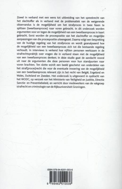 Zowel in verband met een wens tot uitbreiding van het spreekrecht van het slachtoffer als in verband met de problematiek van de weigerende observandus is de mogelijkheid om het strafproces in twee fasen te splitsen (tweefasenproces) naar voren gebracht. In dit onderzoek worden argumenten voor en tegen de mogelijkheid van een tweefasenproces in kaart gebracht. Eerst worden de procespositie van het slachtoffer en mogelijke aanpassingen van die procespositie uiteengezet. Daarna volgt een bespreking van de huidige regeling van het strafproces en wordt geanalyseerd hoe de mogelijkheid van een tweefasenproces zich tot die bestaande regeling verhoudt. In interviews is verkend hoe vijftien personen werkzaam in de strafrechtspraktijk over vragen die in verband staan met de mogelijkheid van een tweefasenproces denken; in deze studie gaat de aandacht vooral uit naar de argumenten die deze personen voor hun standpunten naar voren brachten. Ten slotte wordt een beeld geschetst van onderdelen van het straf(proces)recht die voor de eventuele invoering van de mogelijkheid van een tweefasenproces relevant zijn in het recht van België, Engeland en Wales, Duitsland en Zweden. Het onderzoek is uitgevoerd in opdracht van het WODC, op verzoek van het Ministerie van Veiligheid en Justitie, Directie Sanctie- en Preventiebeleid, en verricht door medewerkers van de vakgroep strafrecht en criminologie van de Rijksuniversiteit Groningen.
