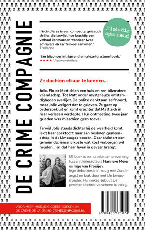 Nachtdieren is een unieke samenwerking tussen thrillerauteurs Hanneke Meier en Inge van Prooijen. Van Prooijen debuteerde in 2023 met Zonder angst en brak door met De bonusmoeder. Meiers debuut De perfecte dochter verscheen in 2025.