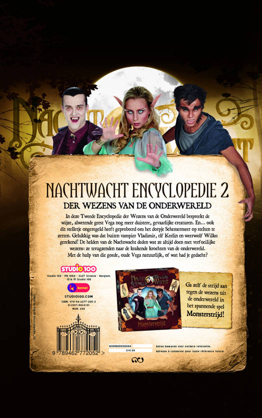 In deze Tweede Encyclopedie der Wezens van de Onderwereld bespreekt de wijze, alwetende geest Vega nog meer duistere, gevaarlijke creaturen. En... ook dít stelletje ongeregeld heeft geprobeerd om het dorpje Schemermeer op stelten te zetten. Gelukkig was dat buiten vampier Vladimir, elf Keelin en weerwolf Wilko gerekend! De helden van de Nachtwacht deden wat ze altijd doen met verfoeilijke wezens: ze terugzenden naar de krakende krochten van de onderwereld. Met de hulp van die goede, oude Vega natuurlijk, of wat had je gedacht?