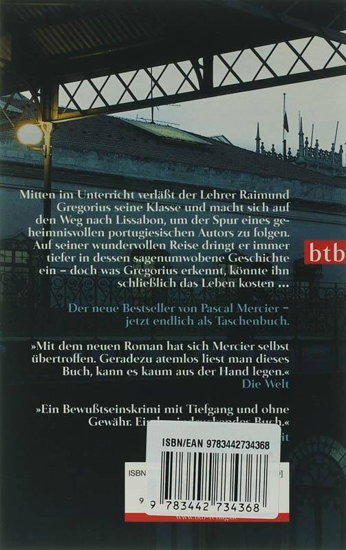 Mitten im Unterricht verlässt ein Lehrer seine Schule und macht sich auf den Weg nach Lissabon, um den Spuren eines geheimnisvollen Autors zu folgen. Immer tiefer zieht es ihn in dessen Aufzeichnungen und Reflexionen, immer mehr Menschen lernt er kennen, die von diesem Mann, den ein dunkles Geheimnis umgibt, zutiefst beeindruckt waren. Eine wundervolle Reise - die vergeblich sein muss und deren Bedrohungen der Reisende nicht gewachsen ist. Endlich kann er wieder fühlen, endlich hat er von seinem Leben zwischen Büchern aufgeblickt - aber was er sieht, könnte ihn das Leben kosten ...