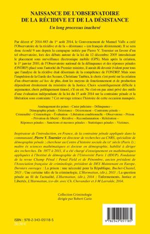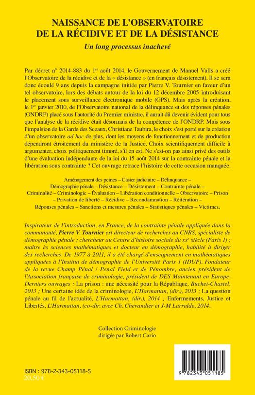L'analyse de la récidive aurait logiquement dû relever de la compétence de l'Observatoire national de la délinquance et des réponses pénales placé sous l'autorité du Premier ministre. Mais sous l'impulsion de Christiane Taubira le choix s'est porté sur la création d'un observatoire ad hoc de plus, dépendant du ministère de la Justice : l'Observatoire de la récidive et de la désistance (août 2014). Ne s'est-on pas ainsi privé des outils d'une évaluation indépendante de la loi du 15 août 2014 sur la contrainte pénale et la libération sous contrainte ?