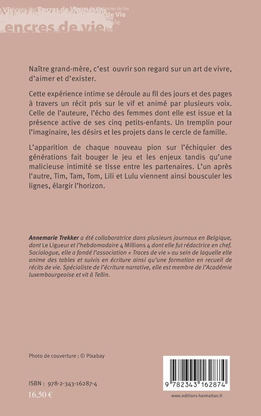 Naître grand-mère, c'est ouvrir son regard sur un art de vivre, d'aimer et d'exister. Cette expérience intime se déroule au fil des jours et des pages à travers un récit pris sur le vif et animé par plusieurs voix. Un tremplin pour l'imaginaire, les désirs et les projets dans le cercle de famille. L'apparition de chaque nouveau pion sur l'échiquier des générations fait bouger le jeu et les enjeux tandis qu'une malicieuse intimité se tisse entre les partenaires.