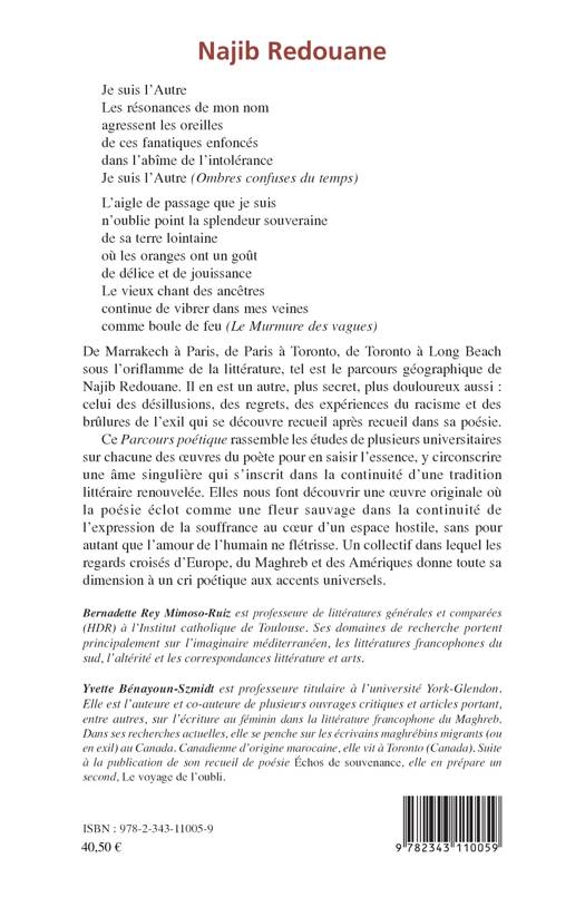 Ce Parcours poétique rassemble les études de plusieurs universitaires sur chacune des oeuvres du poète Najib Redouane pour en saisir l'essence. Elles nous font découvrir une oeuvre originale où la poésie éclot comme une fleur sauvage dans la continuité de l'expression de la souffrance au coeur d'un espace hostile, sans pour autant que l'amour de l'humain ne flétrisse. Un collectif dans lequel les regards croisés de l'Europe, du Maghreb et des Amériques donne toute sa dimension à un cri poétique aux accents universels.