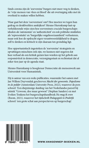 Waar gaat het deze ‘soevereinen’ om? Hoe moeten we tegen hun gedrag en denkbeelden aankijken? Menno Hurenkamp laat op verhelderende wijze zien hoe soevereinen cruciale burgerschapsidealen als ‘autonomie’ en ‘authenticiteit’ en ook politieke middelen als ‘representatie’ en ‘burgerlijke ongehoorzaamheid’ verbasteren, maar ook hoe de opdracht eigen verantwoordelijkheid te dragen, zelf te denken en kritisch te zijn daaraan ten grondslag ligt.