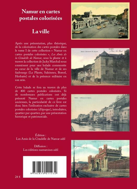 De nombreux livres présentent Namur au travers des cartes postales anciennes. Cette nouvelle collection (Namur en cartes postales colorisée) propose une toute nouvelle approche via ce type particulier de support qu’est la carte postale colorisée. Après une présentation, plus théorique, de la colorisation des cartes postales dans le tome 1 de cette collection Namur en cartes postales colorisées, Les Amis de la Citadelle de Namur, sous la plume et à travers la collection de Jacky Marchal nous emmènent pour une balade commentée au cœur de la ville de Namur et de ses faubourgs (La Plante, Salzinnes, Bomel, Herbatte) et de la présence militaire en son sein. Cette balade se fera au travers de plus de 400 cartes postales colorisées. Si de nombreuses publications ont déjà présenté Namur en cartes postales anciennes, la particularité de ce livre est donc bien l’utilisation exclusive de cartes postales colorisées, introduites, quartier par quartier, par une présentation historique et patrimoniale.