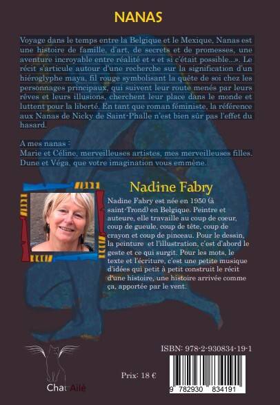 NANAS / Voyage dans le temps entre la Belgique et le Mexique, Nanas est une histoire de famille, d’art, de secrets et de promesses, une aventure incroyable entre réalité et « et si c’était possible...». Le récit s’articule autour d’une recherche sur la signification d’un hiéroglyphe maya, fil rouge symbolisant la quête de soi chez les personnages principaux, qui suivent leur route menés par leurs rêves et leurs illusions, cherchent leur place dans le monde et luttent pour la liberté. En tant que roman féministe, la référence aux Nanas de Nicky de Saint-Phalle n’est bien sûr pas l’effet du hasard. A mes nanas : Marie et Céline, merveilleuses artistes, mes merveilleuses filles. Dune et Véga, que votre imagination vous emmène.