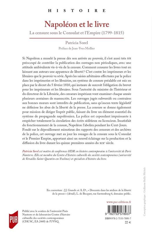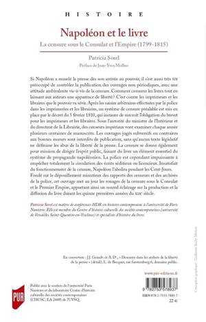 Fondé sur le dépouillement minutieux des rapports des censeurs et des archives de la police, cet ouvrage met au jour les rouages de la censure sous le Consulat et le Premier Empire, apportant ainsi un nouvel éclairage sur la production et la diffusion du livre durant les quinze premières années du XIXe siècle.