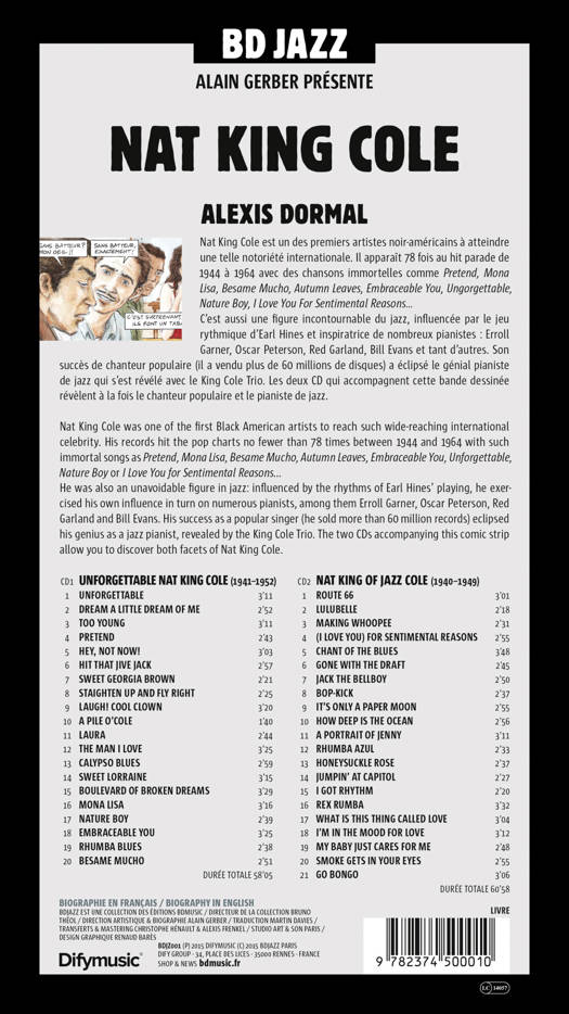 Une biographie de Nat King Cole, écrite par Christian Bonnet, illustrée par Alexis Dormal, accompagnée de 2 compact discs.<br /><br /><br /><br /> Nathaniel Adams Cole, Pianiste, Chanteur et Compositeur.<br /><br /><br /><br /> 1917 Né le 17 mars, à Montgomery Alabama<br /><br /> 1921 Elevé à Chicago dans une famille de musiciens<br /><br /> 1929 Joue de l'orgue à 12 ans et chante dans l'église de son père pasteur.<br /><br /> 1934 Forme et dirige son propre groupe : Nat Coles and his Rogues Of Rhythm.<br /><br /> Le Sextet Eddie Cole's Solid Swingers avec les frères de Nat, trouve un engagement de 6 mois au Panama Club dans la 58ème Rue à Chicago, où Nat rencontre une danseuse du club, Nadine Robinson, sa future épouse.<br /><br /> 1936 Organise un Big Band, part en tournée et revient sans argent.<br /><br /> Engagé dans le revue Shuffle Along (Dans le style Eubie Blake Revue) et repart en tournée. <br /><br /> La revue se fait voler la caisse par des membres indélicats de la troupe et Nat achève la tournée sur la côte ouest au piano solo dans les clubs.<br /><br /> Premiers enregistrements chez Decca "Honey Hush"<br /><br /> 1937 Joue au Century Club sur Santa Monica Boulevard à Los Angeles.<br /><br /> 1939 Forme le King Cole Trio avec le guitariste Oscar Moore et le bassiste Wesley Prince remplacé ultérieurement par Johnny Miller. Lors de leur première prestation au Swanee Inn d'Hollywood le batteur Lee Young n'est jamais venu. Le trio décide alors qu'il peut se passer de batteur et le King Cole Trio est né.<br /><br /> Le Trio n'avait pas l'intention de devenir un trio vocal. Les trois membres s'étaient embarqués pour un projet instrumental, mais les clients de la Swanee Inn commencèrent à demander aux musiciens de chanter. Le succès fut tel que les titres chantés se multiplièrent et le King Cole Trio devint un trio vocal autant qu'instrumental.<br /><br /> 1939/1940 Le King Cole Trio enregistre 11 titres pour le label Davis & Schwegler.<br /><br /> 1940 Mai & juin, le trio enregistre avec Lionel Hampton Central avenue Breakdown et Jack the Bellboy.<br /><br /> 6 décembre, premier enregistrement du Trio chez Decca où le Trio enregistrera 16 faces. Le premier titre choisi par Nat : Sweet Lorraine<br /><br /> 1942 Enregistre à Los Angeles avec Lester Young et Red Callender: Indiana, Body And Soul, I Can't Get Started et Tea For Two.<br /><br /> 1943 Staighten Up And Fly Right est un hit qui atteint le public blanc et débute sa carrière de chanteur populaire.<br /><br /> Joue dans le film Here comes Elmer<br /><br /> Enregistre désormais chez Capitol (L'intégrale des enregistrements Capitol du Nat King Cole Trio est parue chez Mosaïc – 18 CD)<br /><br /> 1944 Joue dans le film Stars On Parade<br /><br /> 1944/45 En tournée avec Benny Carter.<br /><br /> 1946 The Christmas Song est son premier hit accompagné d'un orchestre de studio.<br /><br /> Joue dans le film Breakfast In Hollywood<br /><br /> Hit N°1 : I love you for sentimental reasons<br /><br /> 1948 Hit N°1 : Nature Boy<br /><br /> 1949 Joue dans le film Make Believe Ballroom<br /><br /> 1950 Hit N°1 : Mona Lisa <br /><br /> 1951 Le King Cole Trio est dissout. <br /><br /> Chanteur "Star" dès la fin des années 40, Nat, après la dissolution du trio continue une carrière de "Star" au cinéma, en concert ou dans les hit parades du monde entier.<br /><br /> 1951 Too Young est N° 1 au Billboard hit single. Unforgettable N° 14.<br /><br /> 1953 Joue dans les films Blue Gardenia et Small Town Girl<br /><br /> 1956/57 Anime son propre programme télévisé.<br /><br /> 1957 Joue dans les films Istambul et China Gate <br /><br /> 1958 Joue dans le film St Louis Blues. (Il joue le rôle de W.C. Handy)<br /><br /> 1959 Joue dans le film Night Of The Quarter Moon <br /><br /> 1944 – 1964 Au total 78 Billboard hit singles <br /><br /> 15 Février 1965 15 février, meurt à Santa Monica Californie d’un cancer du poumon<br /><br /><br /><br /> Le succès phénoménal du chanteur Nat King Cole (plus de 60 millions de disques vendus) a éclipsé le talent du pianiste qui reste pour le monde du jazz un maître et un modèle. Son influence est grande chez Red Garland, Erroll Garner, Oscar Peterson, Bill Evans et bien d'autres.<br /><br /><br /><br /> Pour tous, il reste aussi l'interprète inoubliable de Sweet Lorraine, Unforgettable, Mona Lisa, Autumn Leaves, Embraceable You, Besame Mucho....<br /><br /><br /><br /> "If I had only one artist to listen to through eternity, it would be Nat King Cole" Chuck Berry<br /><br /><br /><br /> CD 1 : UNFORGETTABLE NAT KING COLE<br /><br /><br /><br /> 1. Unforgettable (Gordon) 3’11 <br /><br /> 17 Aug 1951, Nat King Cole (p), Irving Ashby (g), Jo Comfort (b) Nelson Riddle & Orch.<br /><br /> 2. Dream A Little Dream of Me (Schwandt – Andrée – Kahn) 2’52 28 Oct 1947, Cole, Ashby , Miller (b)<br /><br /> 3. Too Young (Lippman –Dee) 3’11 <br /><br /> 2 Feb 1951, Cole, Ashby, Comfort, Les Baxter's Orch, arrt. Nelson Riddle. <br /><br /> 4 Pretend (Douglas – Parman – LaVere) 2’43 30 Dec 1952, Cole, Ashby, Comfort. <br /><br /> 5. Hey, Not Now ! (Roy Alfred) 3'03 <br /><br /> 11 May 1950, Cole, Maria Cole, arrt & dir. Orch. Pete Rugolo<br /><br /> 6 Hit That Jive Jack (Tolbert – Alston ) 2’57 <br /><br /> 22 Oct 1941, Cole, Moore, Prince.<br /><br /> 7 Sweet Georgia Brown (Bernie – Pinkard – Casey) 2’21 23 May 1945, Cole, Moore, Miller<br /><br /> 8 Staighten up And Fly Right (Cole – Mills) 2’25 30 Nov 1943. Cole, Moore, Miller<br /><br /> 9 Laugh ! Cool Clown (Leoncavallo) 3’20 <br /><br /> 22 March 1949, Cole, Ashby, Comfort, Costanzo (bongo-congas)<br /><br /> 10. A Pile O'Cole (Cole) 1’40 <br /><br /> 27 Feb 1945, Cole, Moore, Miller <br /><br /> 11 Laura (Raksin – Mercer) 2'44 <br /><br /> 18 July 1952 Cole, Collins, Harris, Bunny Schawker (d)<br /><br /> 12. The man I Love (Gershwin) 3’25 17 Jan 1944, Cole,