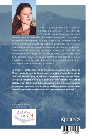 Natacha de Crombrugghe a 28 ans lorsqu'elle disparaît, le 24 janvier 2022, lors d'un trek au Pérou. Grâce à son carnet de voyage, ses parents retracent les trois semaines qui ont précédé sa disparition puis racontent leurs recherches sur place pour ramener leur fille en Belgique, évoquant les difficultés et les émotions éprouvées.